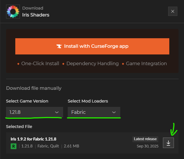 It should install Minecraft, Fabric and all the mods and shaderpacks required to run Minecraft with the selected settings. From here on out, you can run the game from CurseForge (it uses a separate install of Minecraft), or install Minecraft and Fabric from the manual steps above, then right-click the installed modpack in CurseForge, select “Open Folder”, and copy the files in the mods and shaderpacks folders to your main Minecraft install (as in the manual steps)